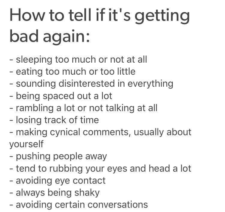 Those are the dangerous times. Thank gods my husband knows what signs to look for, and while his multitude of questions irritate me at the time, it’s the jolt my brain needs to let me know things are getting bad again. I make sure to tell him when the depression and suicidal thoughts have their grip, so he keeps an eye on the means to carry out my thoughts. Sometimes he has to be in possession of my means and prevent me from having unsupervised access until I’m okay again.